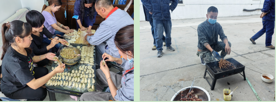 當(dāng)“圓月皎皎在中天”時,各車間、各班組里處處洋溢著歡聲笑語,大家積極秀廚藝,展示各自烹飪技能、享受美食,像一家人一樣圍坐一起,分享著“團圓”的味道!