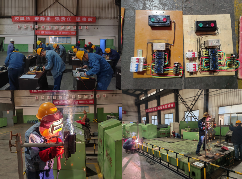 電工競賽現(xiàn)場,參賽選手面對繁瑣的配盤指導圖從容應對。剪線、剝線、壓接……,一招一式都是那么的嫻熟輕快,肅靜的環(huán)節(jié)里沖刺著“濃濃的火藥味”;而維修工比賽現(xiàn)場內卻異常熱鬧,新老電工、鉗工圍繞在設定的操作臺前,緊鑼密鼓地剪裁組料、焊接配件、清理焊渣、打磨表面,一套動作行云流水、一氣呵成。