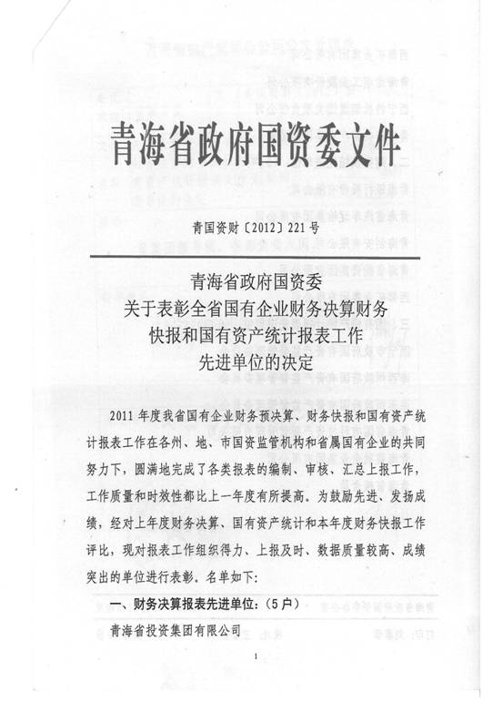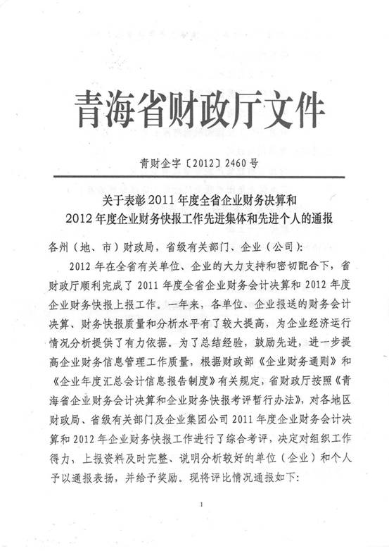 2012年,在集團(tuán)及所屬各公司領(lǐng)導(dǎo)的高度重視下,在所屬各公司的大力支持和密切配合下,在辛勤工作在財(cái)務(wù)會(huì)計(jì)崗位上的同事們的共同努力下,集團(tuán)總公司圓滿完成了省國(guó)資委和省財(cái)政廳各類報(bào)表的上報(bào)工作,財(cái)務(wù)信息工作質(zhì)量、時(shí)效性和財(cái)務(wù)分析水平都比上一年度有所提高,受到了省國(guó)資委和省財(cái)政廳的好評(píng),集團(tuán)總公司2011年度財(cái)務(wù)決算工作被省國(guó)資委評(píng)為先進(jìn)單位,集團(tuán)財(cái)務(wù)審計(jì)部張莉青同志被省財(cái)政廳評(píng)為2012年度財(cái)務(wù)快報(bào)工作先進(jìn)個(gè)人。